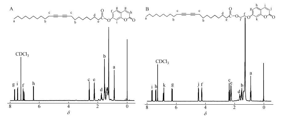 2類香豆素取代二乙炔單體參照文獻所述方法合成,分子結構及產物核磁譜圖如圖1所示。將2種產物分別溶於氯仿,配成1mg/mL的溶液。亞相為超純水(18.2MΩ·cm)。所有的π-A曲線和LB膜拉製實驗均為20℃條件下在KSV Mini-trough LB膜儀上進行。溶劑充分揮發後,膜障以5 mm/min的速率對其壓縮,在20℃和恒定膜壓35 mN/m下以2mm/min速率沉積Y-型LB膜。基片為石英片。薄膜的聚合是在16W的紫外燈(波長254nm)輻照下完成的,薄膜表麵距離燈管下緣10cm,輻照時間5min。