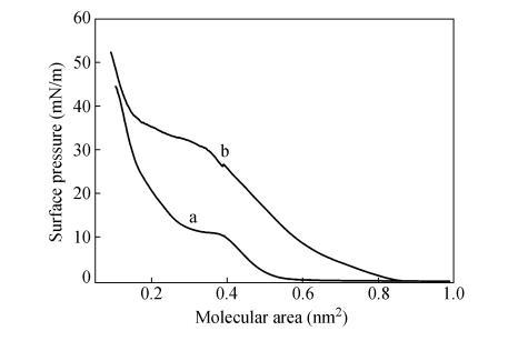 2種單體分子結構相似,CO2DA比CODA多了一CH₂-CH₂O一柔性間隔基,整個分子的舒展程度相對較大。當CODA分子在水麵鋪展時,與水分子的相互作用小,分子"平躺"在水麵上,當膜障壓縮單分子膜時,CODA分子受到側向壓力時容易發生滑移,形成多層膜。而CO2DA分子端基親水性相對較強,當膜障壓縮單分子膜時分子在水麵能立起來,並與液麵形成一定的夾角。因此CO2DA單分子膜占據麵積較大,崩潰壓較高。