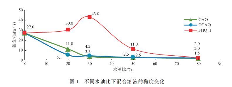 將CAO、CCAO和FHQ-I分別與現場采集的黏度約為27mPa·s的原油進行混合,配置成200ml混合溶液,用六速旋轉黏度計在200r/min的條件下,對水油比分別為20%、30%、50%和80%的混合溶液的黏度進行測量,結果如表3和圖1所示。