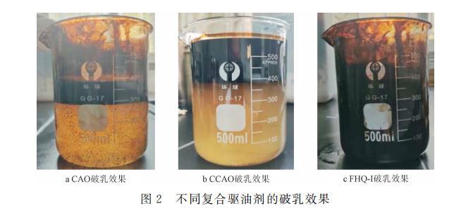 取一定量的CAO、CCAO或FHQ-I以及約35%的原油分別和65%的模擬地層水置於500ml燒杯中,將燒杯放入30℃六速攪拌器中,以200r/min的速度恒溫攪拌20min,使其完全乳化,破乳效果如圖2所示。