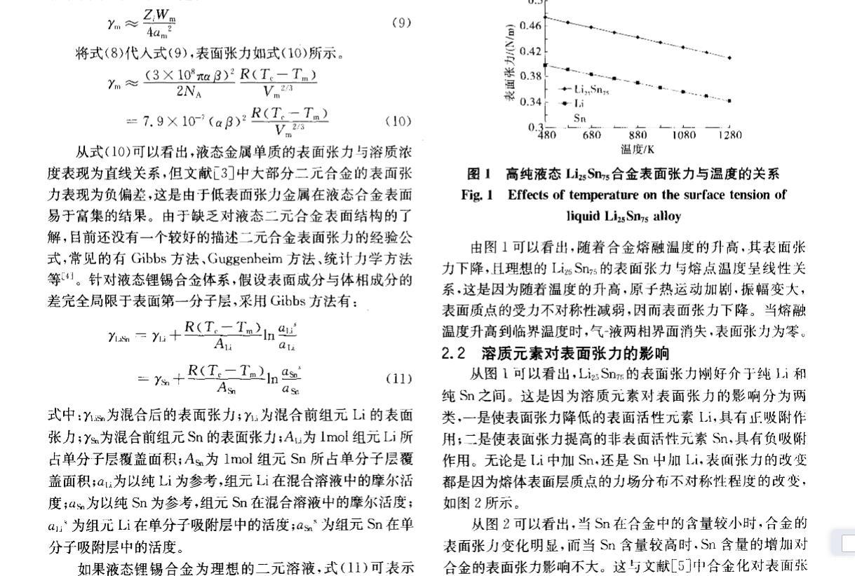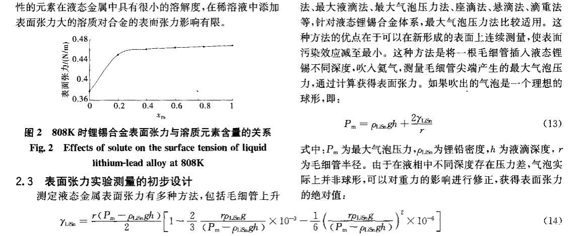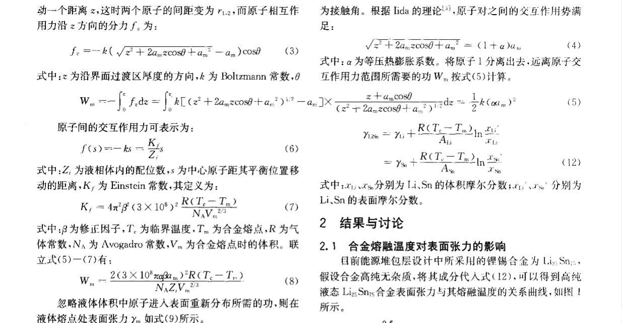 核能是公認現實可行的、可大規模替代常規能源的清潔能源。聚變堆或聚變_裂變混合堆液態金屬包層因其固有特性和優勢,在國際上被普遍認為是未來電站最具發展潛力的包層設計方案之一。作為包層氚增殖劑和冷卻劑的鋰錫合金與鋰鉛合金一樣,具有廣闊的發展前景,其製備、純化、質量輸運等工藝難題正逐步得到重視。液態金屬的表麵張力不僅是認識和理解冶煉過程最基本的物理量之一,而且是氣體吸收、氣泡形核、雜質生長等界麵現象的控製因素。目前對液態金屬表麵張力的研究多集中於金屬單質,合金的表麵或界麵行為在理論或實驗上都相當不足,主要是由於精確確定表麵張力十分困難[2]。針對液態鋰錫合金這種新型的核材料,從基礎研究方麵看,目前還沒有一種實驗方法能確定液體界麵的結構,即兩個相之間過渡區域的結構,因此需要有一些假設或模型來滿足表麵張力理論的研究。