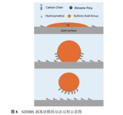 如圖8所示,SDDBS剝離油膜機理可從以下三個方麵進行闡釋,首先SDDBS吸附在油水界麵上降低了油水界麵張力;其次,SDDBS的二羥基通過氫鍵作用強化了其與岩石表麵吸附,磺酸基團富集於岩石表麵使得岩石表麵由親油轉變為強親水,極大地增加了油滴在岩石表麵接觸角,降低粘附功而使得油膜易於剝離;最後,由於SDDBS在油水界麵和岩石表麵同時吸附,增加剝離後油滴與岩石表麵間的靜電斥力,使得剝離後油膜不易重新粘附壁麵,實現高效剝離。