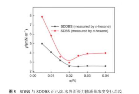 圖5 SDBS與SDDBS正己烷-水界麵張力隨質量濃度變化曲線