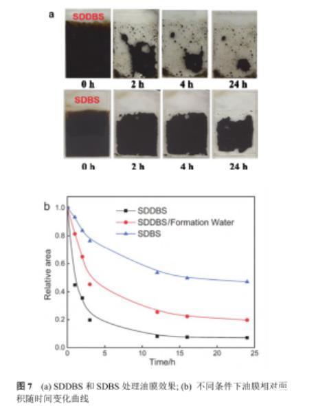 如圖7a所示,經SDDBS溶液處理後,油膜麵積降低明顯,油膜收縮最終以油珠形式從岩石表麵脫離.而經SDBS溶液處理後,油膜麵積僅有少量減少,24 h後仍有大部分油膜未被有效剝離.油膜相對麵積隨時間的變化曲線如圖7b所示,SDDBS處理後,24 h內油膜麵積減小了89%(黑色曲線).而油膜在SDBS中麵積僅減小約53%(藍色曲線),說明羥基的引入有效促進了油膜剝離.使用模擬地層水(配方見表S2,見支持信息)配置0.02%(w)SDDBS溶液,以相同方法進行油膜剝離實驗,得到圖7b紅色曲線.由圖可得,地層水條件下SDDBS溶液的油膜剝離效果減弱,24 h內油膜麵積減小了81%,結合前述潤濕性調控與界麵張力結果,鹽濃度的增加雖然降低了油水界麵張力,但同時使得處理後表麵水下油滴接觸角減小,疏油性減弱,最終導致油膜剝離效果變差,說明油固界麵潤濕性調控在油膜剝離中起重要作用.較於文獻報道仍具有優越效果,說明製備的SDDBS具有良好的油藏環境適應性,實際應用潛力巨大.