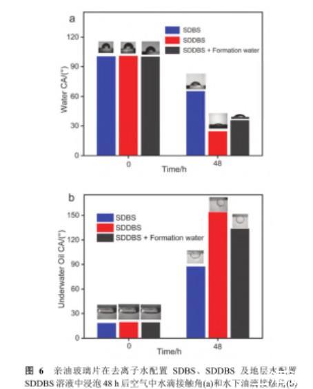 親油處理後玻璃片的空氣中水滴接觸角為100.2°,水下油滴接觸角為19.2°,為疏水親油性質.將親油玻璃片分別浸泡在0.02%(w)去離子水配置的SDBS、SDDBS溶液和地層水配置的SDDBS溶液中48 h,使用接觸角測量儀分別測量不同處理時間下其水滴接觸角及水下油滴接觸角.結果如圖6所示.SDDBS潤濕性調控能力較SDBS有較大提升,處理後空氣中水滴接觸角由65.1°降至24.5°,水下油滴接觸角由87.3°升至153.9°.經SDDBS處理後的玻璃片呈現親水/水下強疏油性質.為探究鹽對界麵潤濕調控性能的影響,使用地層水配置的SDDBS溶液處理親油玻璃片,結果表明處理後空氣中水滴接觸角為35.6°,水下油滴接觸角為133.6°,說明地層水的引入降低了SDDBS對親油表麵的親水疏油調控效果.這是由於地層礦化度條件下,SDDBS分子鏈團聚影響界麵吸附,導致潤濕調控能力略有下降.