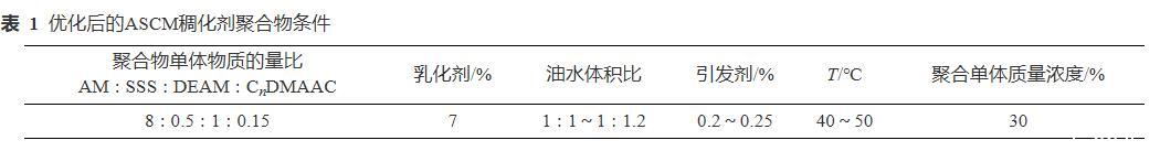 綜上所述,優化後的ASCM聚合條件如表1所示,采用優化後合成條件製備的ASCM聚合物稠化劑為白色均勻乳狀液,在25℃下產品本體黏度小於250 mPa·s,在−10℃下本體黏度為300~360 mPa·s,產品流動性好,便於抽吸,滿足冬季低溫條件下使用需求;常溫下放置30 d,無分層,無析出等異常,產品穩定性好。
