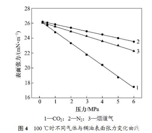 在礦場情況下,煙道氣的組成很複雜,但其中N2和CO2的摩爾分數之和超過90%。在實驗過程中,對煙道氣的組成進行簡化,使用的煙道氣由N2和CO2按照一定的比例混合得到。在前麵的研究中,煙道氣的組成均為80%N2+20%CO2(摩爾分數),因此,煙道氣-稠油表麵張力是CO2和N2對稠油表麵張力的綜合體現。