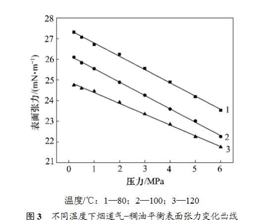 為了研究溫度和壓力對煙道氣-稠油平衡表麵張力的影響,分別在80,100和120℃下進行實驗,圖3所示為不同溫度下煙道氣-稠油平衡表麵張力隨壓力變化曲線。由圖3可見:當氣體壓力從0.2 MPa升高到6MPa,在80℃時,煙道氣-稠油表麵張力由27.31mN/m減小到23.53mN/m,降低了13.84%;在100℃時,煙道氣-稠油表麵張力由26.10mN/m減小到22.26mN/m,降低了14.71%;在120℃時,煙道氣-稠油表麵張力由 24.75 mN/m減小到 21.75 mN/m,降低了12.12%。當溫度一定時,煙道氣-稠油係統的平衡表麵張力隨著壓力的增大而減小,並呈較好的線性關係。這是因為溫度一定時,壓力增大,煙道氣在稠油中的溶解度增大,使得平衡表麵張力減小。當壓力一定時,煙道氣-稠油係統的平衡表麵張力隨溫度的升高而減小。這是因為煙道氣的主要成分是N2,N2在稠油中的溶解度隨著溫度升高而增大。