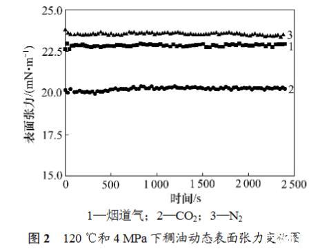 由於煙道氣在原油中具有一定的溶解度,油滴形成後,煙道氣會向原油中擴散、溶解,一直持續到油滴被煙道氣飽和。為了檢測氣體向原油中溶解、擴散對表麵張力的影響,對煙道氣-稠油係統的動態表麵張力進行測定。圖2所示為120℃和4MPa下測量的煙道氣-稠油動態表麵張力,其中煙道氣組成為80%N2+20%CO2(摩爾分數),並與CO2-稠油和N2-稠油的表麵張力進行對比。