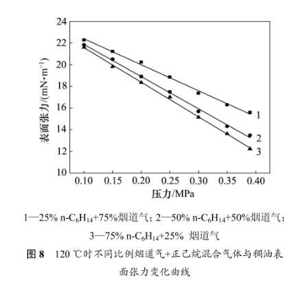 圖7對比了120℃時煙道氣、正己烷和煙道氣+正己烷3種氣體與稠油的表麵張力變化規律。由圖7可見:當溫度一定時,3種氣體-稠油表麵張力均隨壓力的增大而減小,但是變化的幅度不同;在低壓下,煙道氣對降低稠油表麵張力作用有限,當氣體中含有正己烷時,稠油的表麵張力明顯降低;在120℃和0.3 MPa時,煙道氣-稠油表麵張力為24.70mN/m,向煙道氣中加入50%(摩爾分數)的正己烷後表麵張力為15.89mN/m,與純正己烷氣體表麵張力相差不大,後者為 15.19 mN/m。前麵的研究表明,煙道氣-稠油表麵張力可以由 CO2-稠油表麵張力和 N2-稠油表麵張力線性疊加得到,但是對於煙道氣+正己烷混合氣體,正己烷對降低表麵張力起主要作用,不能簡單的由煙道氣-稠油表麵張力和正己烷-稠油表麵張力進行簡單的線性插值進行計算。