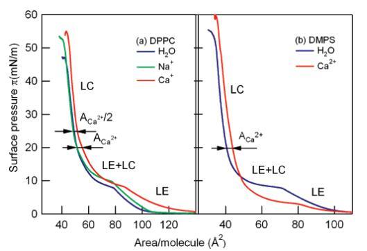圖2:DPPC(A)和DMPS(b)在不同亞相上的壓力麵積(π-A)等溫線:淨水(藍色)、1 M NaCl溶液(綠色)、1 M CaCl2溶液(紅色)。沿等溫線顯示了液相膨脹相(LE)、液相凝聚相(LC)和兩相共存區(LE+LC)。ACa2+代表鈣離子的麵積。