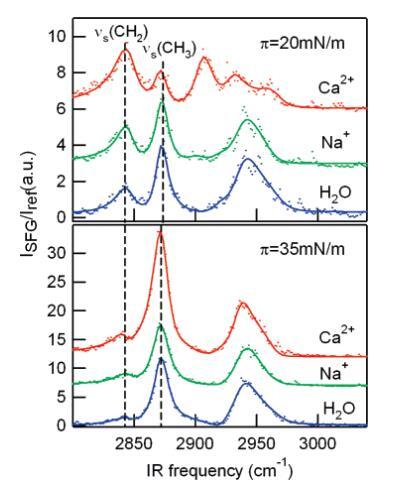 振動和頻發生光譜學(VSFG)。VSFG是一種非線性振動光譜技術,可提供界麵分子構象順序和方向的表麵特定信息,進一步研究了在Ca2+存在下這種改變相行為的分子起源。21,22為了量化離子對脂質尾部構象的影響,在C-H拉伸區域收集VSFG光譜。沿等溫線測量了幾個表麵壓力的光譜;圖5顯示了DPPC單層在20 mN/m和35 mN/m下三種不同亞相的光譜。可以觀察到五種振動模式:以2876、2970和2938 cm-1為中心的峰值分別歸屬於CH3對稱拉伸、CH3反對稱拉伸和CH3費米共振。22 CH2對稱和反對稱拉伸頻率約為2846和2920 cm-1。氘化DPPC脂質單層(d62和d75 DPPC)上的VSFG實驗顯示膽堿C-H伸展的信號非常低。
