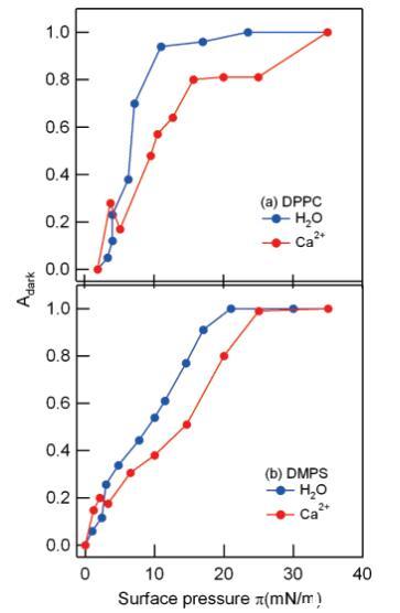 圖4:。在淨水(藍色)和1 M CaCl2溶液(紅色)上,DPPC(a)和DMPS(b)單分子膜的熒光圖像中暗有序LC域的部分麵積Adark隨表麵壓力的變化。注意周圍標記的局部最大值∼在存在Ca2+離子的情況下,兩種脂質均為3 mN/m。