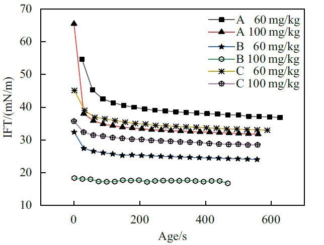 為了充分證明時間效應對懸滴法測定結果會造成影響,實驗使用懸滴法對A,B,C三種表麵活性劑複配溶液較稀含量下的動態表麵張力進行了研究。結果如圖3所示。